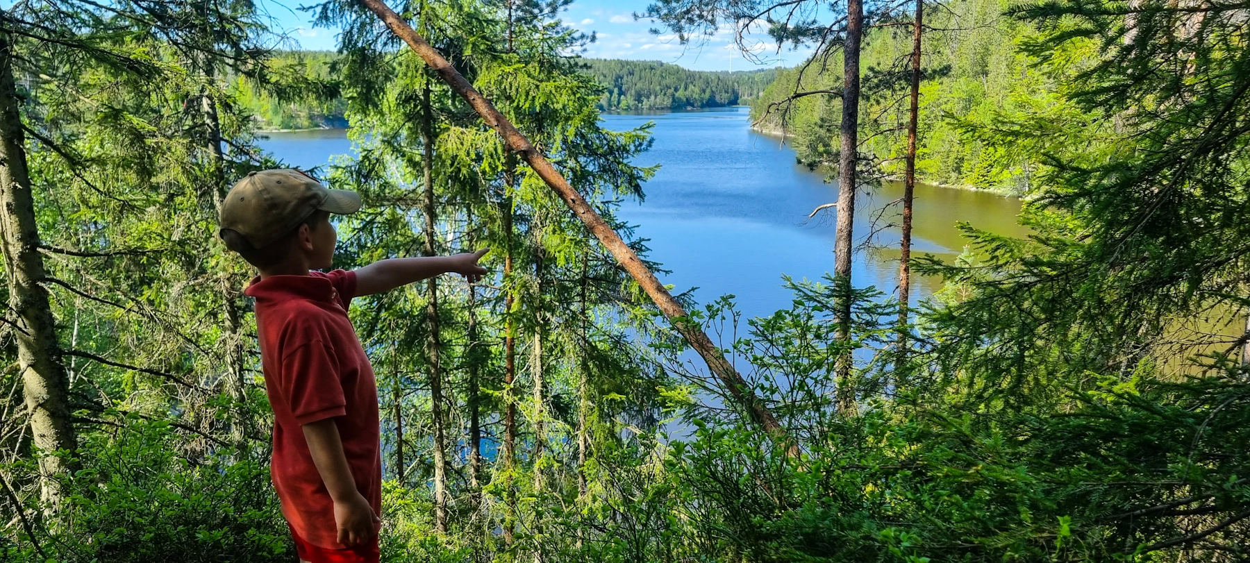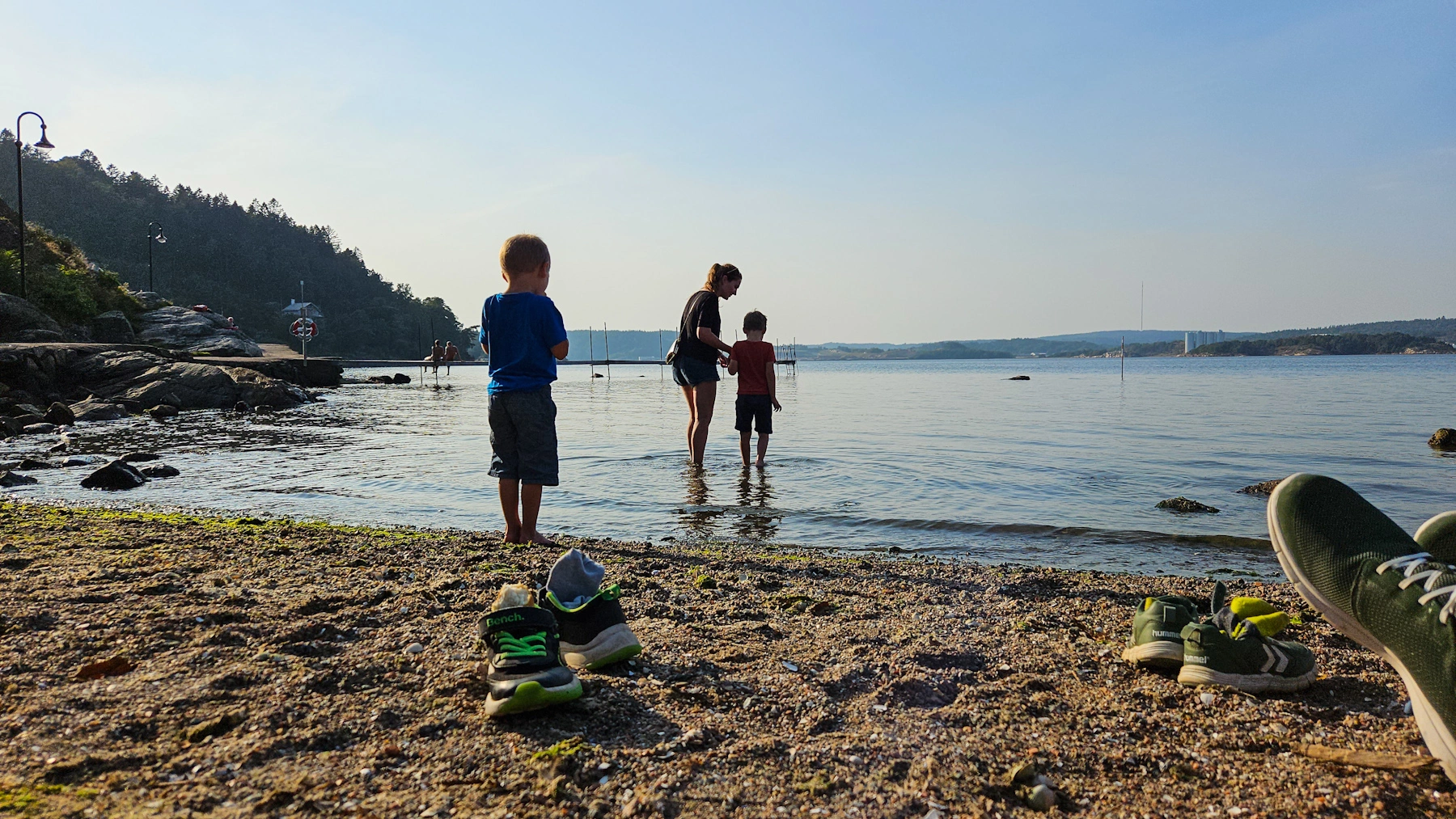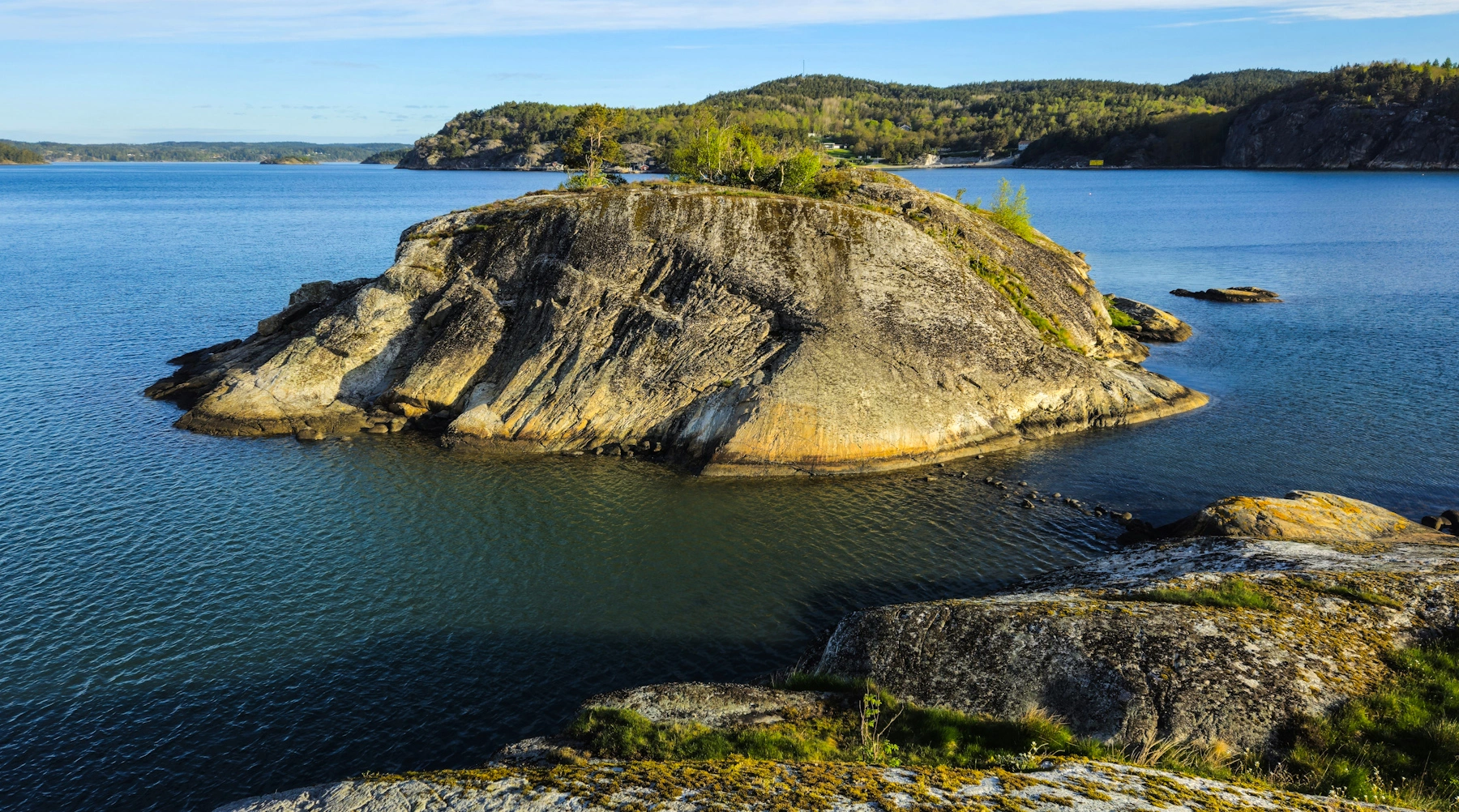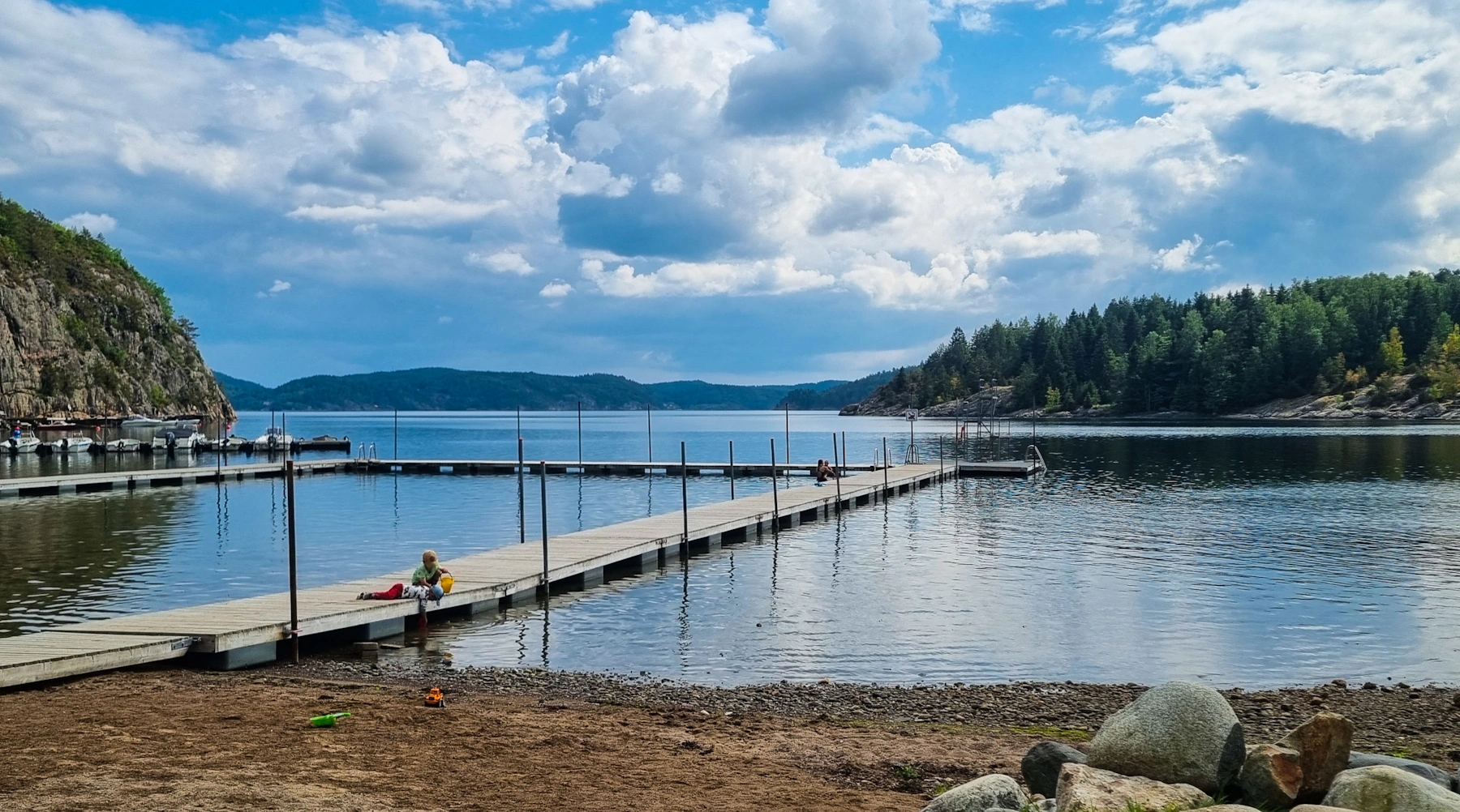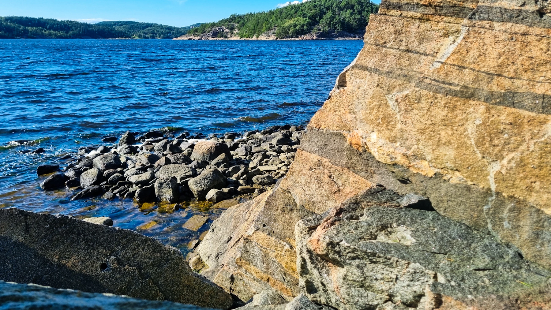 2) Von hier aus kann man zu einer interessanten Wanderung starten. Diese führt auf den Havsten, ein Felsen weit über der Wasseroberfläche mit spektakulärer Aussicht über die Fjordwelt. Das Ufer hier bietet aber auch sehr interessante Verweilplätze: Kiefernwald direkt bis ans Wasser und sehr interessante Steinstrände, mit schönen Plätzen die zu einem Picknick einladen.