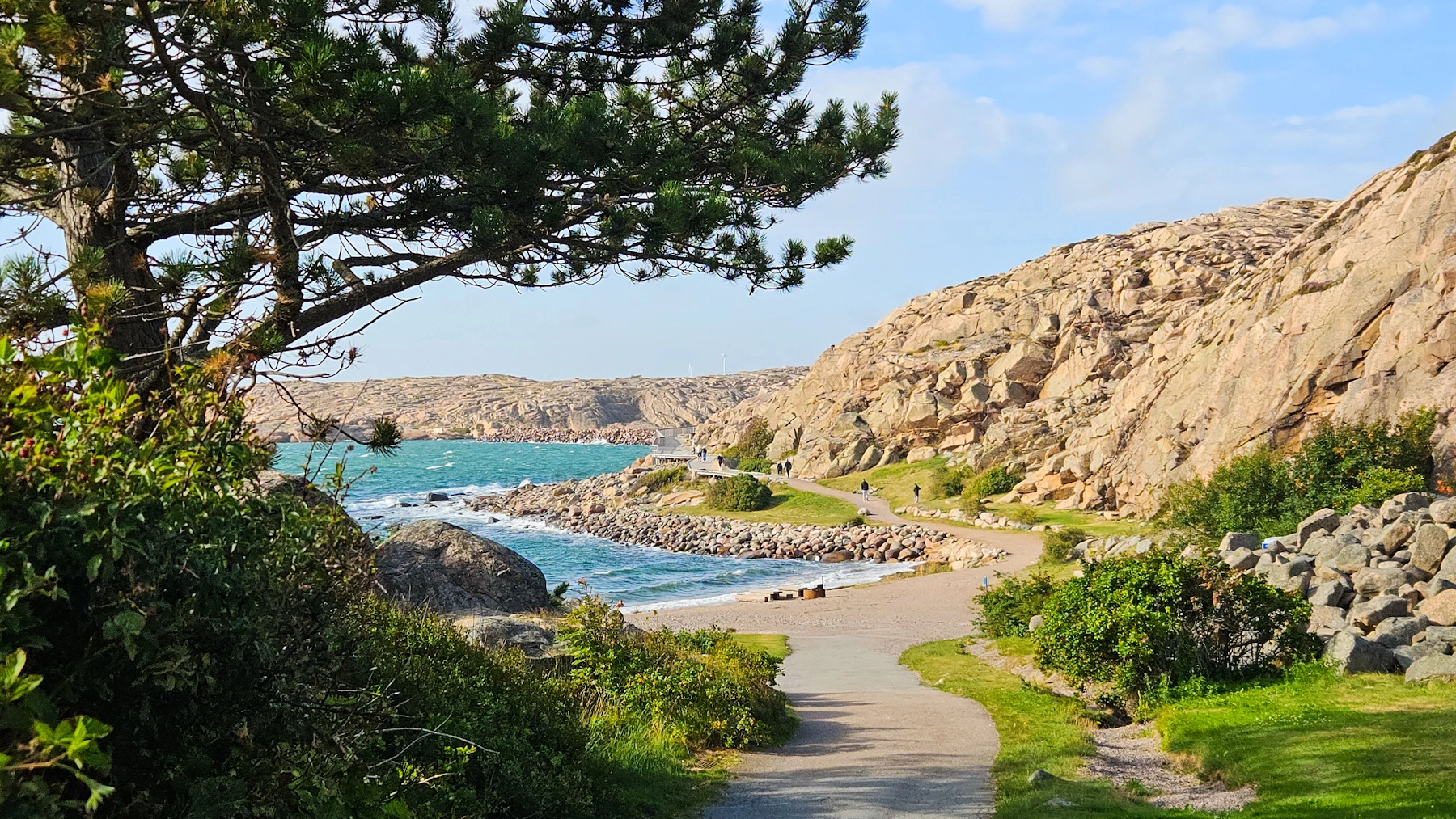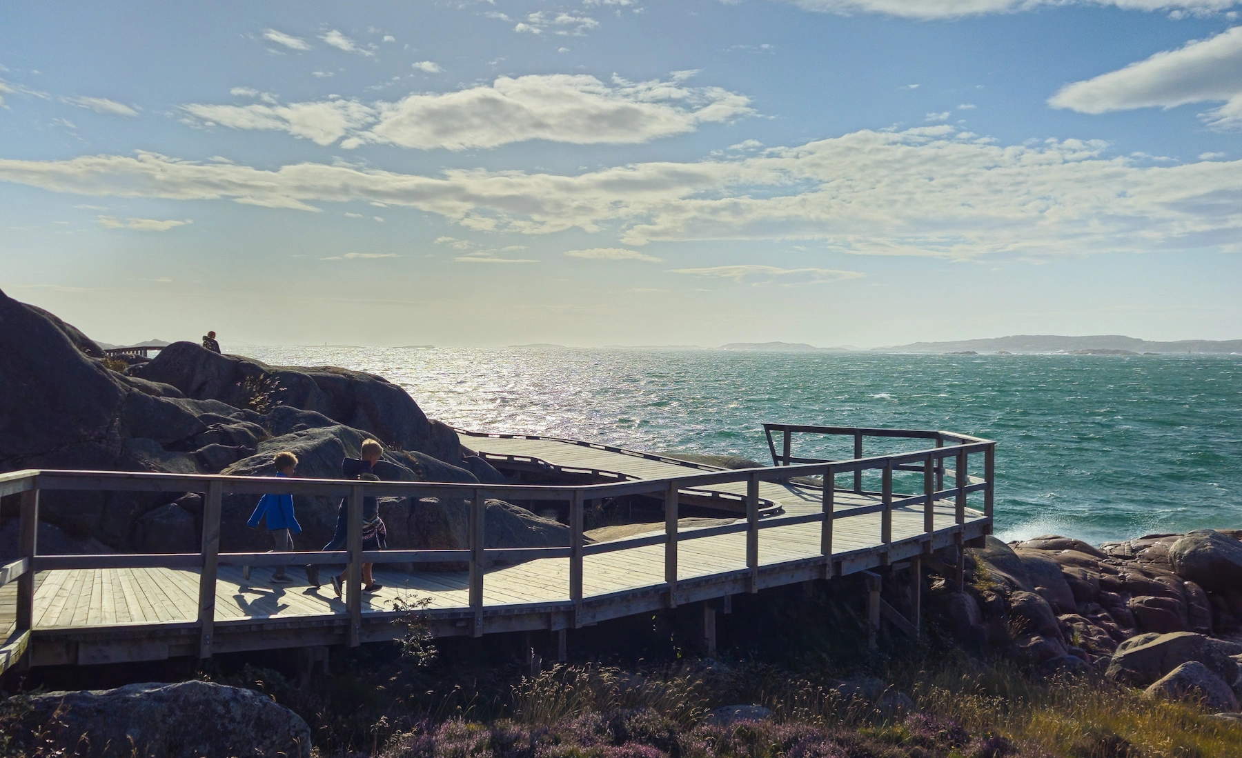An markanten Granitfelsen befestigter Holzweg mit Blick auf Schären und das offene Meer. Vor allem bei Sonnenuntergang ein Genuss, jedoch bei jedem Wetter absolut empfehlenswert – bei Sturm ebenso eindrucksvoll wie bei Sonnenschein! Der Weg ist barrierefrei und man kann ihn ohne Probleme mit Kinderwagen gehen. Durchbrochen wird der Holzbohlenweg von tollen Strandabschnitten. Verschiedenste sehr liebevoll gestaltete Sitzgelegenheiten laden zum Verweilen ein und wer sich traut, nimmt ein Bad im Meer und nutzt dafür den Sprungturm. Infotafeln entlang des Weges informieren über Meeresbewohner und Unterwasserwelt. Zu Beginn des Weges gibt es einen Parkplatz, und direkt daneben ein beliebtes Restaurant mit Meeresblick (NH5).
