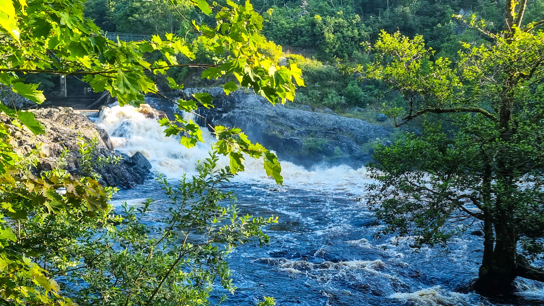 Auf diesem Bild sieht man nur den Fluss und das Taldirekt unterhalb des Wasserfalls. Kraftwerk und Schleusen liegen aber direkt in der Nähe, etwas unterhalb