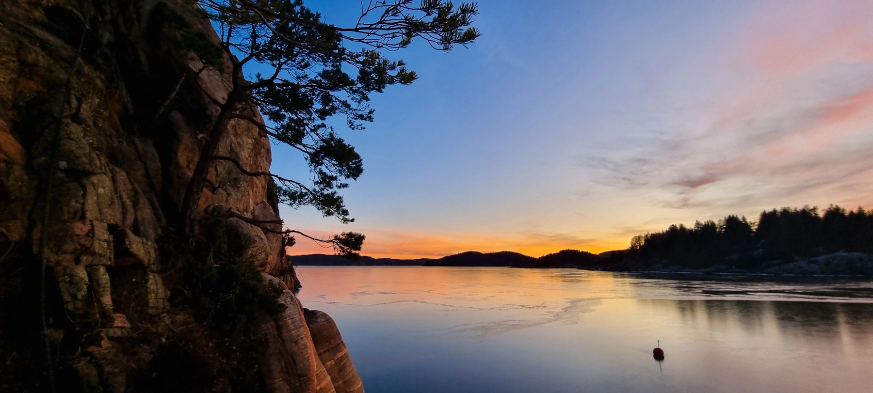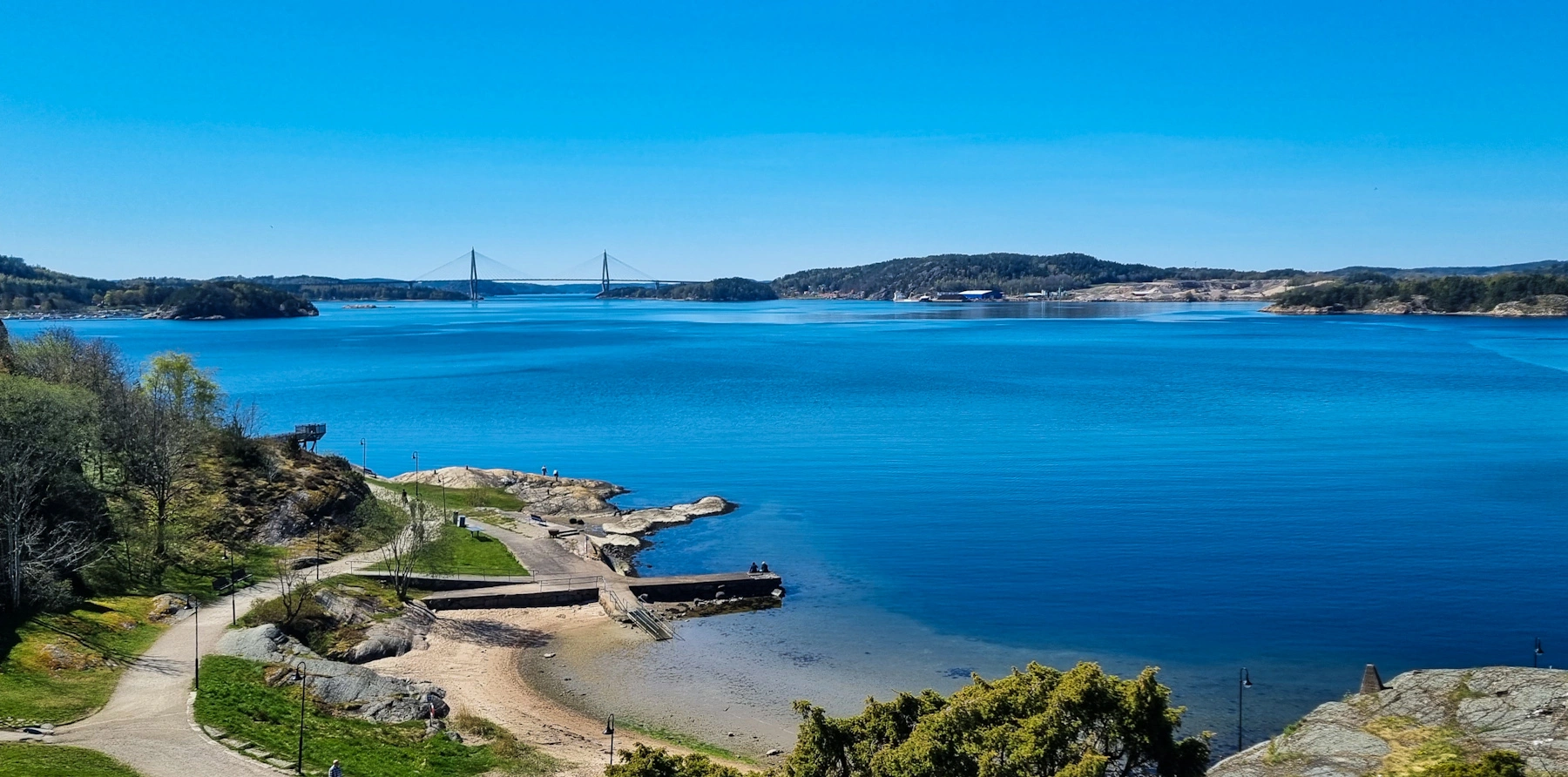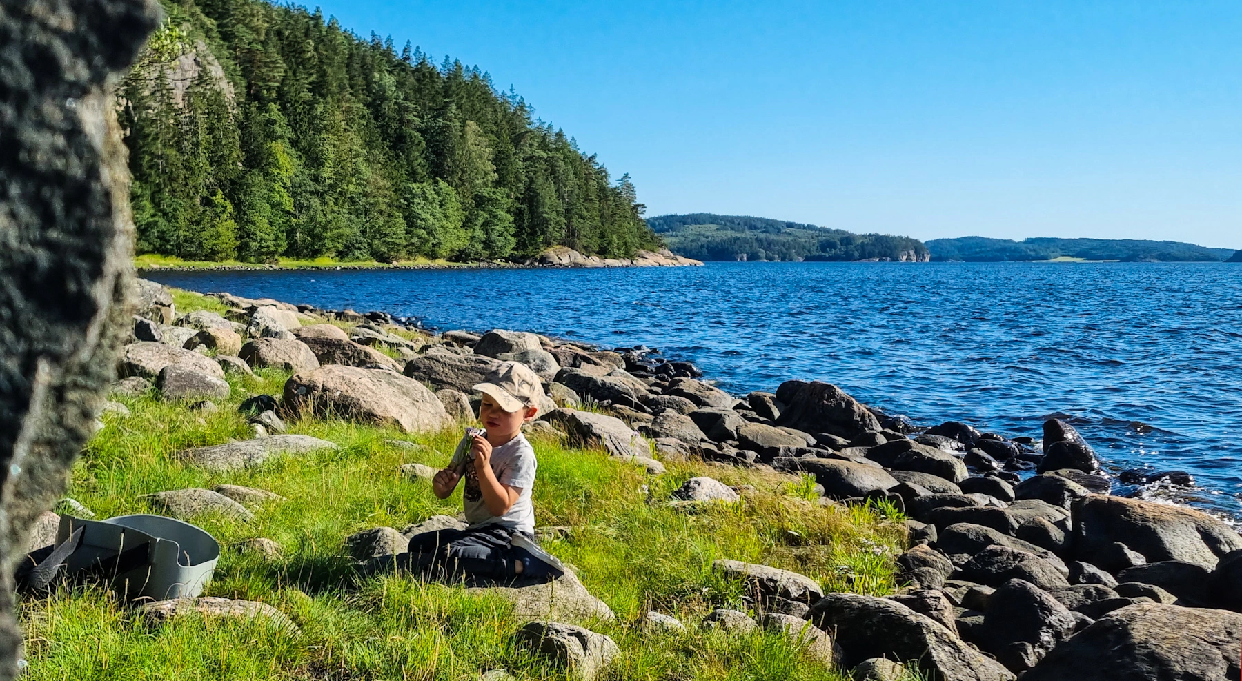 2) Von hier aus kann man zu einer interessanten Wanderung starten. Diese führt auf den Havsten, ein Felsen weit über der Wasseroberfläche mit spektakulärer Aussicht über die Fjordwelt. Das Ufer hier bietet aber auch sehr interessante Verweilplätze: Kiefernwald direkt bis ans Wasser und sehr interessante Steinstrände, mit schönen Plätzen die zu einem Picknick einladen.