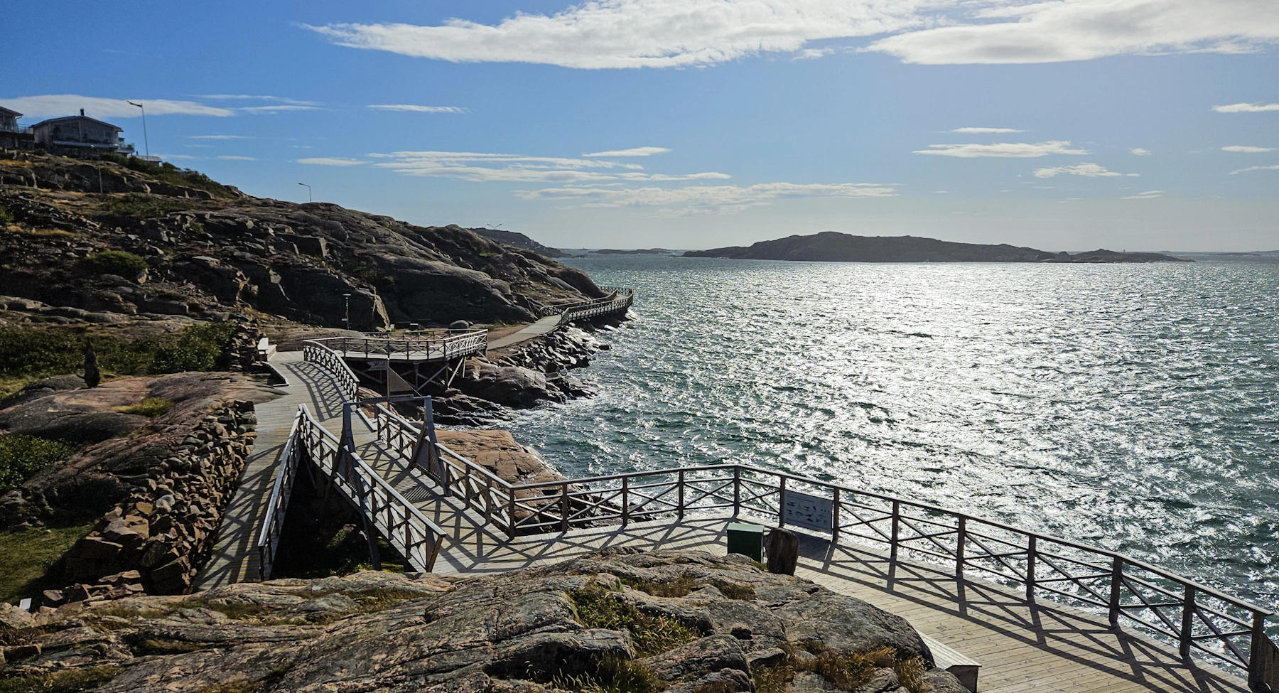 An markanten Granitfelsen befestigter Holzweg mit Blick auf Schären und das offene Meer. Vor allem bei Sonnenuntergang ein Genuss, jedoch bei jedem Wetter absolut empfehlenswert – bei Sturm ebenso eindrucksvoll wie bei Sonnenschein! Der Weg ist barrierefrei und man kann ihn ohne Probleme mit Kinderwagen gehen. Durchbrochen wird der Holzbohlenweg von tollen Strandabschnitten. Verschiedenste sehr liebevoll gestaltete Sitzgelegenheiten laden zum Verweilen ein und wer sich traut, nimmt ein Bad im Meer und nutzt dafür den Sprungturm. Infotafeln entlang des Weges informieren über Meeresbewohner und Unterwasserwelt. Zu Beginn des Weges gibt es einen Parkplatz, und direkt daneben ein beliebtes Restaurant mit Meeresblick (NH5).